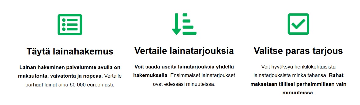 Ensinnäkin sivuston käyttöliittymä on erittäin yksinkertainen ja kaikki oleellinen löytyy heti alusta. Hakemus on simppeli ja nopeasti täytettävä. Mikä parasta, nopeimmillaan ensimmäiset lainatarjoukset voivat saapua sähköpostiin heti hyväksytyn päätöksen jälkeen.